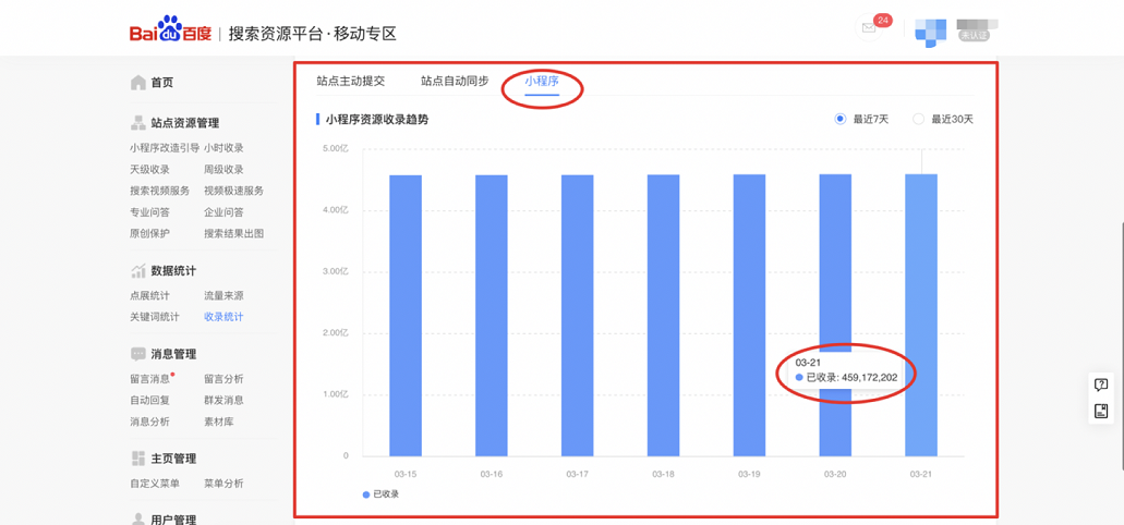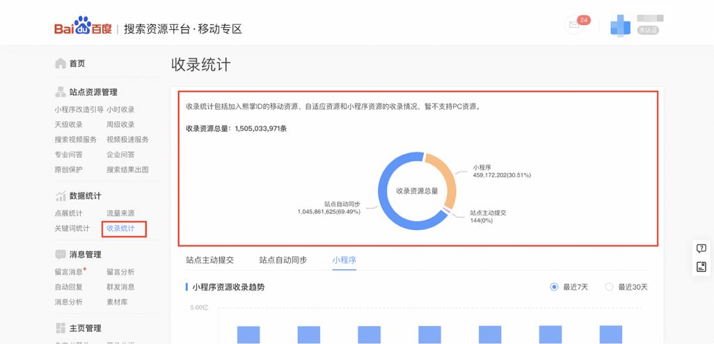如下圖,您可在數據統計-收錄統計中查看小程序收錄資源量,以及在當前熊掌ID下小程序資源量占比。