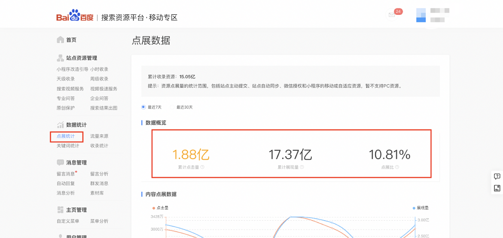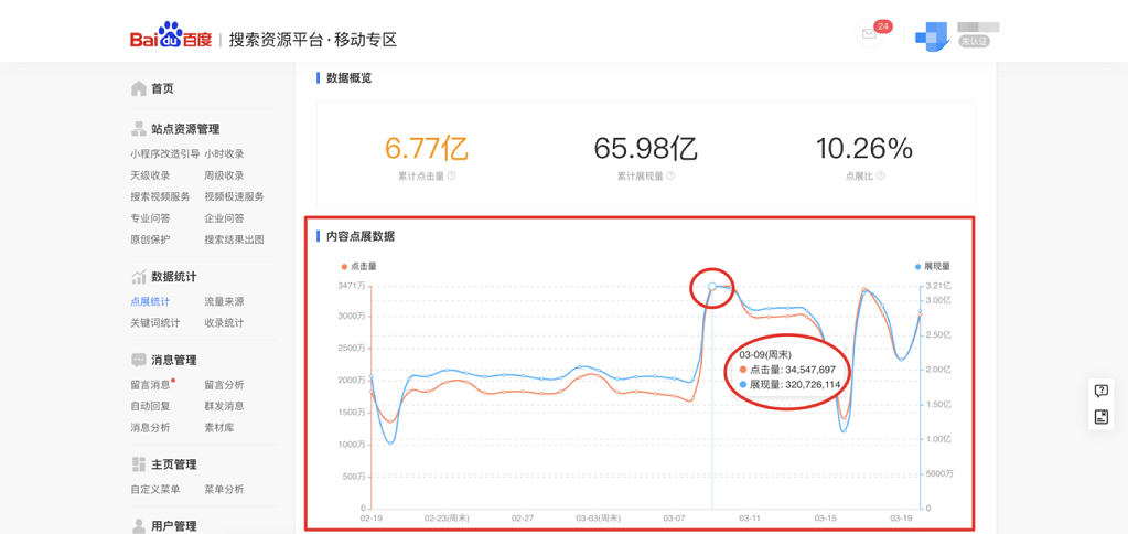如下圖,您可在數據統計-點展統計中查看當前熊掌ID下所有資源的點擊和展現情況(從3月9日起開始包含小程序資源)。