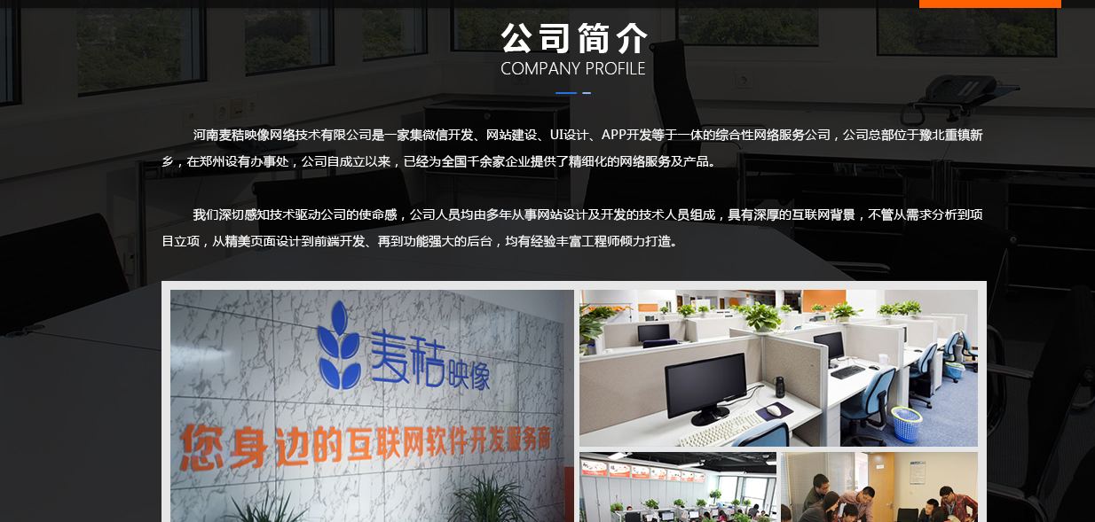 河南麥秸映像網絡技術有限公司是一家集網站建設、UI設計、微信開發、APP開發等于一體的綜合性網絡服務公司,公司總部設在豫北重鎮平頂山網站建設公司,平頂山軟件定制開發,平頂山小程序開發,平頂山微信公眾號開發