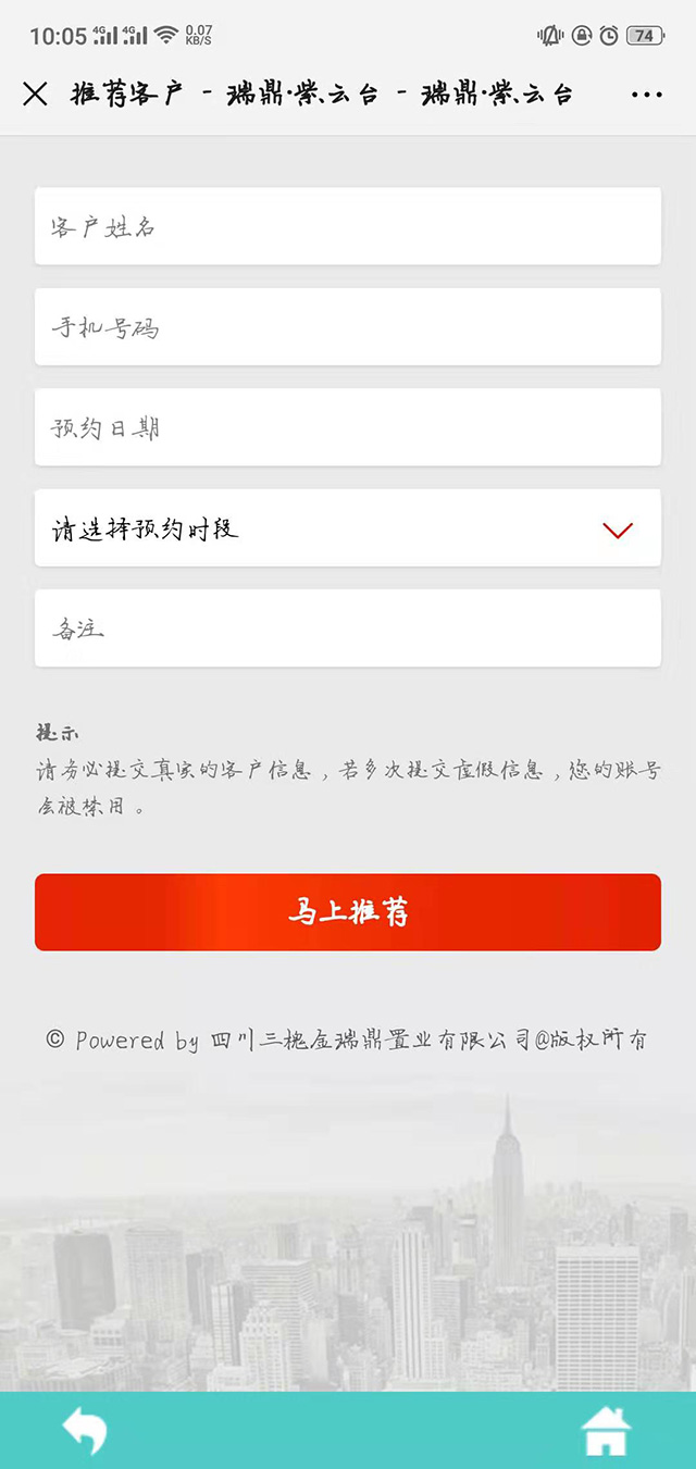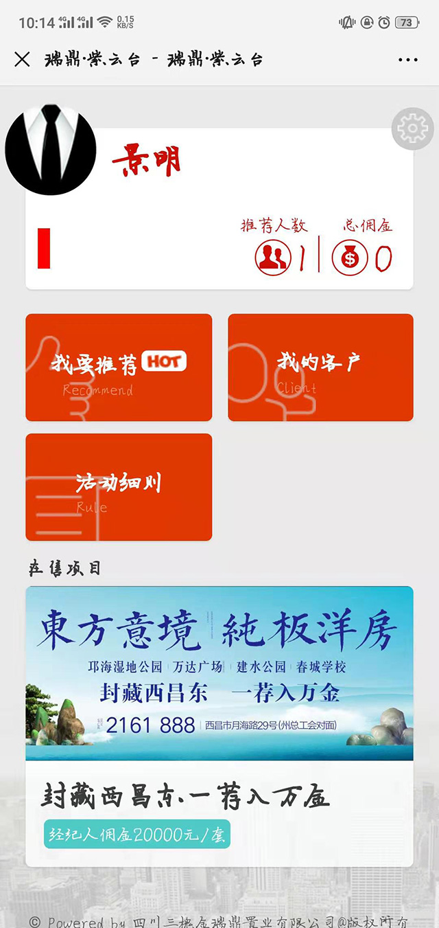 只需關注公眾號,在公眾號注冊一下,每個人都可以是經紀人。注冊完畢之后就可以看到在售項目,我的推薦人數,總傭金,以及活動細則。點擊我要推薦就可以添加客戶。