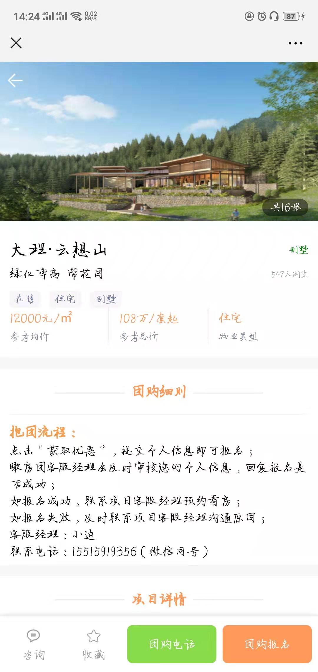 進入選好的房子界面之后還可以看到房源的鳥瞰圖,項目詳情,戶型介紹,樓盤動態、房源配套信息等。最下面可以找客服咨詢房型的具體信息,而且還有團購,獲取優惠券等功能。