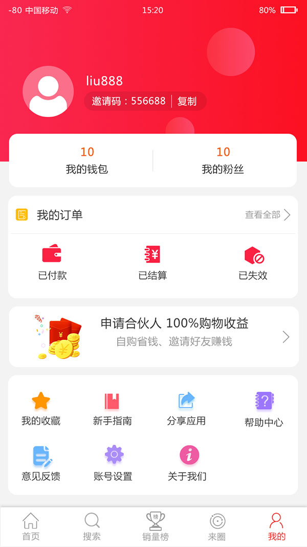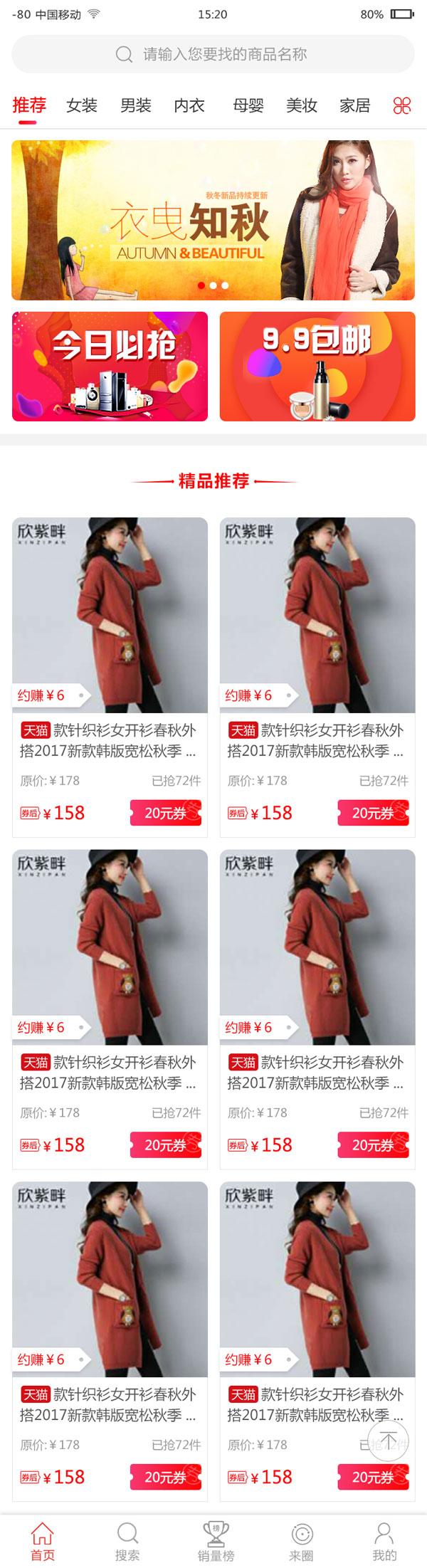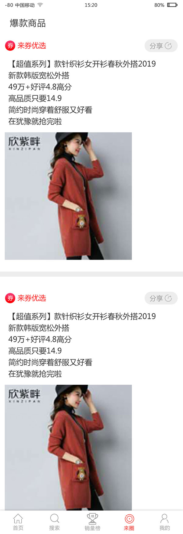 我們還多了銷量榜和來圈功能,銷量榜就是統計銷量的,這個很明顯。但是來圈這個功能就不容易理解了。其實這是一個分享優惠券的小平臺,我們有喜歡的商品就可以分享到來圈上,然后如果是通過您分享的鏈接購買完成的商品,會給予您適當的優惠,通過您分享的鏈接購買完成的人越多,優惠力度就越大。